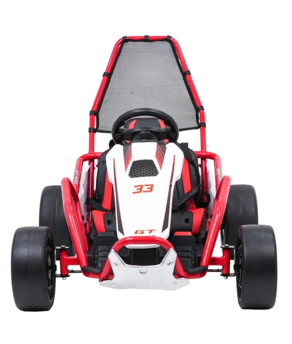 W modelu dostępne są stabilne, 5-punktowe pasy bezpieczeństwa z miękkimi osłonami na ramiona. Dobrze stabilizują one pozycję kierowcy i ograniczają ryzyko przesunięcia się na zakrętach. Uruchamianie gokarta odbywa się za pomocą włącznika, który dodatkowo generuje realistyczne odgłosy silnika, co podnosi wrażenia z jazdy. Na desce rozdzielczej obecny jest wygodny wskaźnik naładowania akumulatora, informujący o stanie baterii.