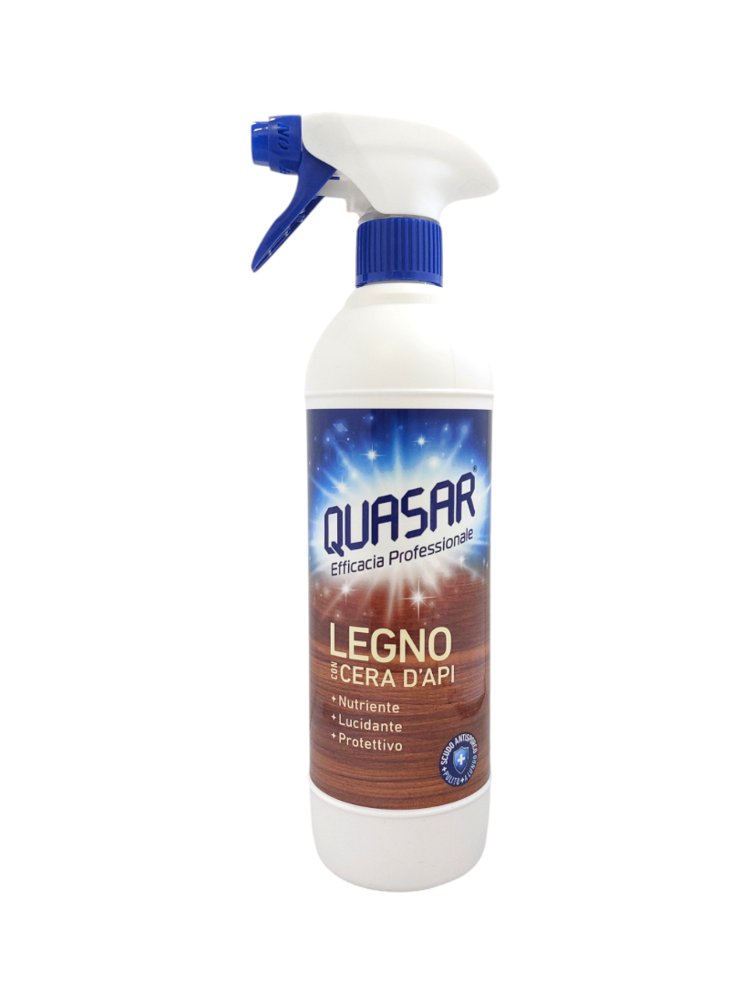 Spray Quasar Legno con cera d'capi to popularny i znakomity włoski detergent przeznaczony do czyszczenia i pielęgnacji wszelkich drewnianych powierzchni oraz parkietów. Jego skład został wzbogacony woskiem pszczelim, dzięki czemu Quasar Legno nie tylko doskonale czyści, ale również chroni drewniane meble, drzwi czy parkiety, pozostawiając jednocześnie bardzo przyjemny zapach i połysk bez smóg.