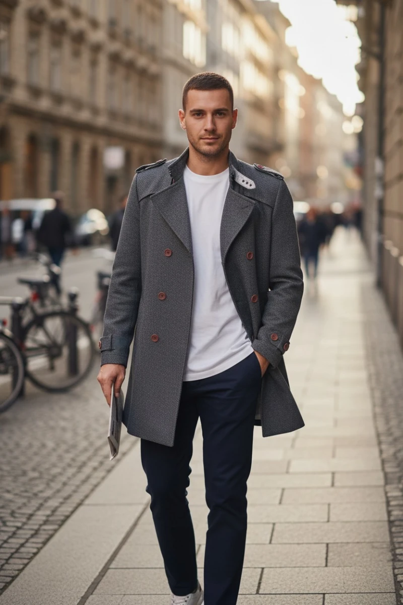 Płaszcz w stanie widocznym na zdjęciach. Idealny dla osoby o wzroście między 170 a 180 cm i wadze około 80 kg